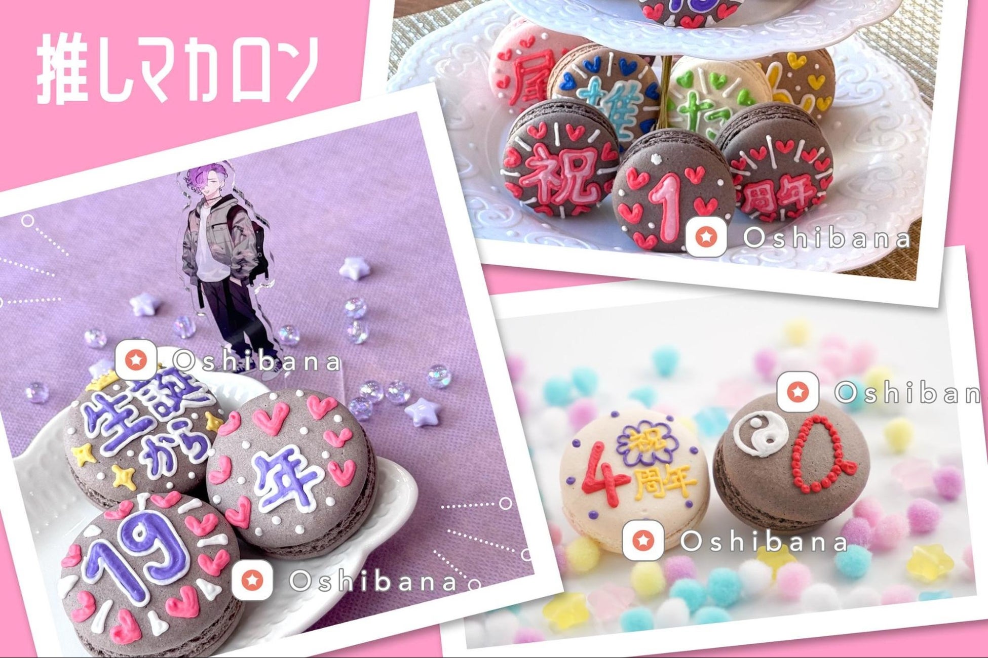 「推しマカロン」は、推し活アプリ 「オシバナ」 が提案する、推しをお祝いするための特別なマカロンです。マカロンと、推し色(推しカラー)、推しマークを組み合わせた造語です。