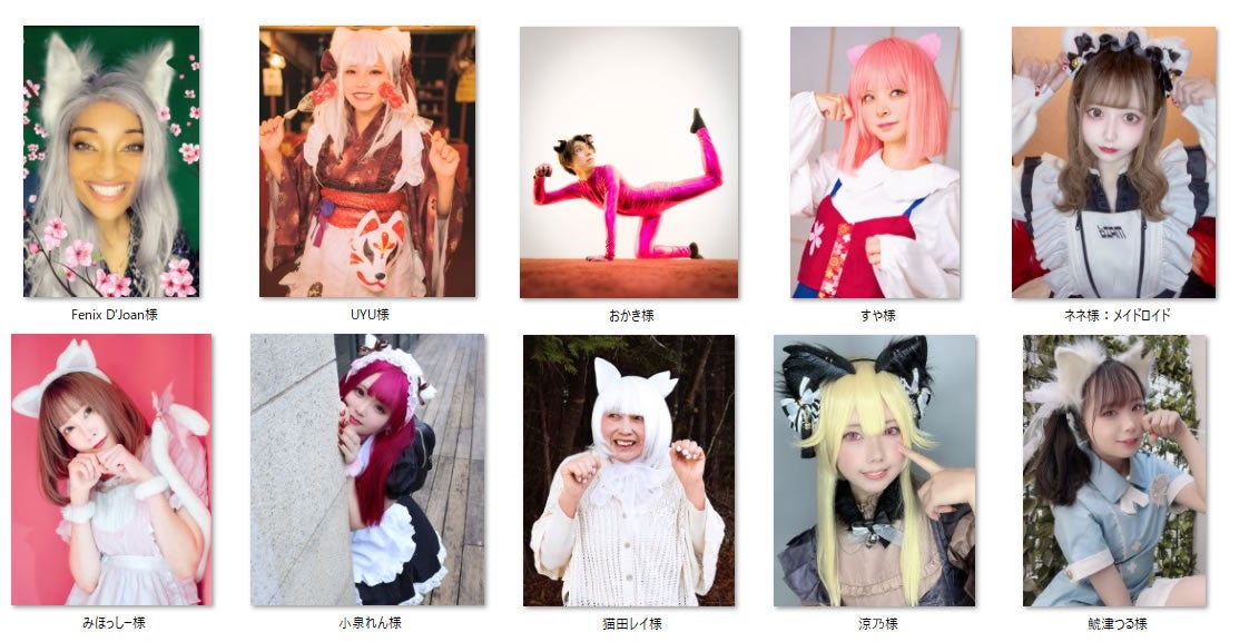 特に激戦となった3次元部門のファイナリストに選ばれたのは、75歳でコスプレ初挑戦の猫田レイ様、日本の萌文化に多様性をもたせたいアメリカ出身のFenix D’Joan様を含む10名です。3次元部門の歴代グランプリ受賞者は、レイヤーズカフェ「ラストエデン」のマシロ様(14代目)、人気コスプレイヤーのやよい様(12代目)、元声優で人気コスプレイヤーのしらゆき様(11代目)、男の娘の榎本玲依様(9代目)、タレントで歌手でレスラーのレディビアード様(8代目)、人気コスプレイヤーの三鷹様(7代目)、アイドルの柚木崎礼央様(6代目)、レースクイーンでタレントののろちゃん様(4代目)など、先輩にゃこ式部は様々なジャンルで活躍中です。