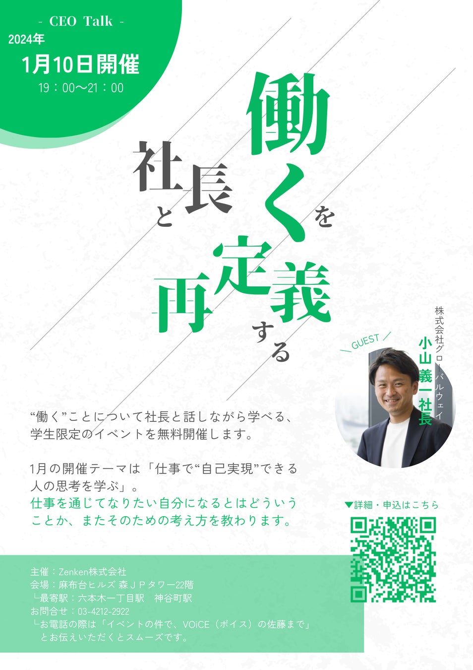 Zenken株式会社(本社:東京都港区、代表取締役社長:林 順之亮、以下 Zenken)は、2025年1月10日、経営者と学生の交流イベント「CEO Talk」(シーイーオートーク)を無料開催いたします。