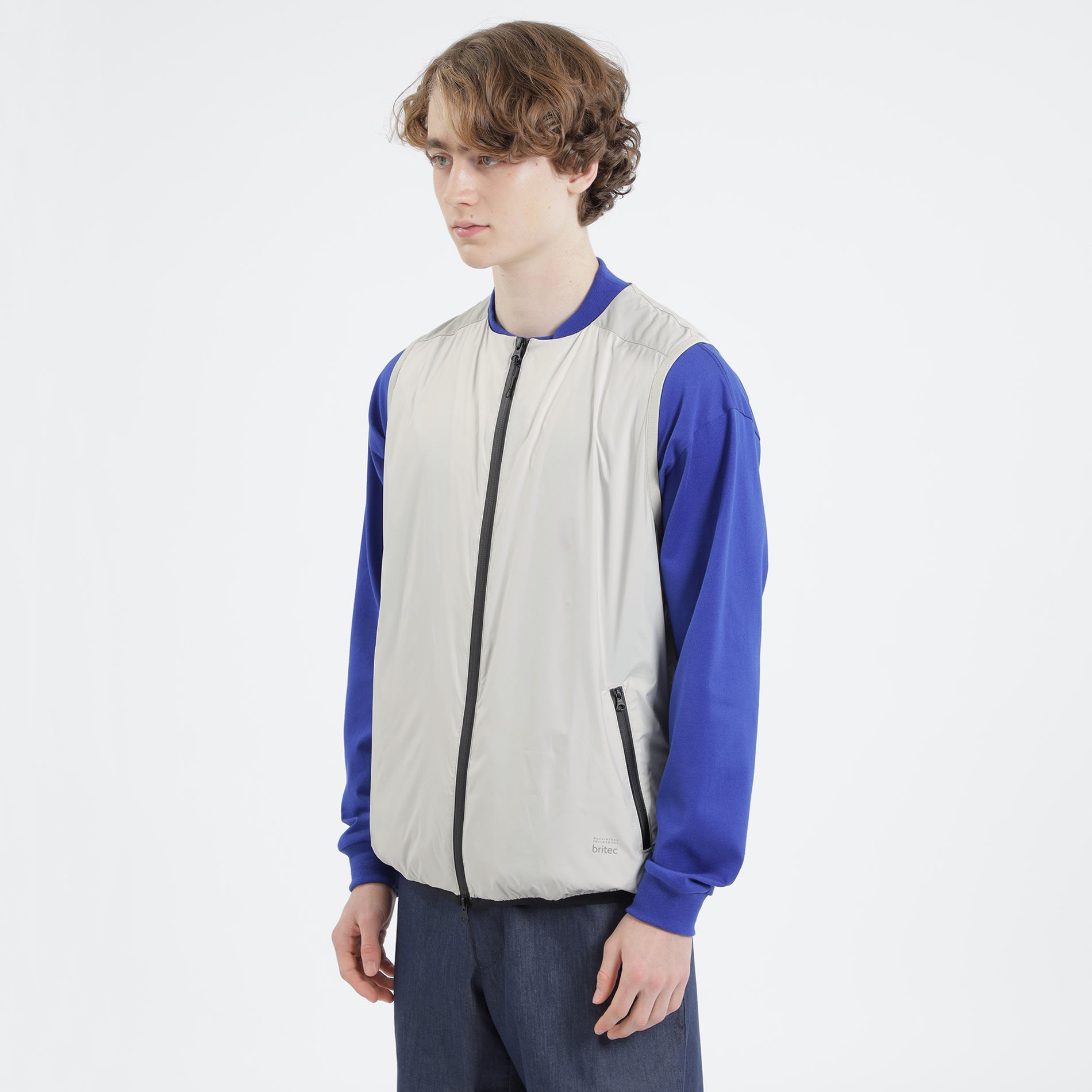 機能性を高めたノーカラーのベスト。袖がないので、デスクワークなどで細かく腕を動かす際にもストレスなく作業していただけます。トラベルシーンでも最適なデザインです。
