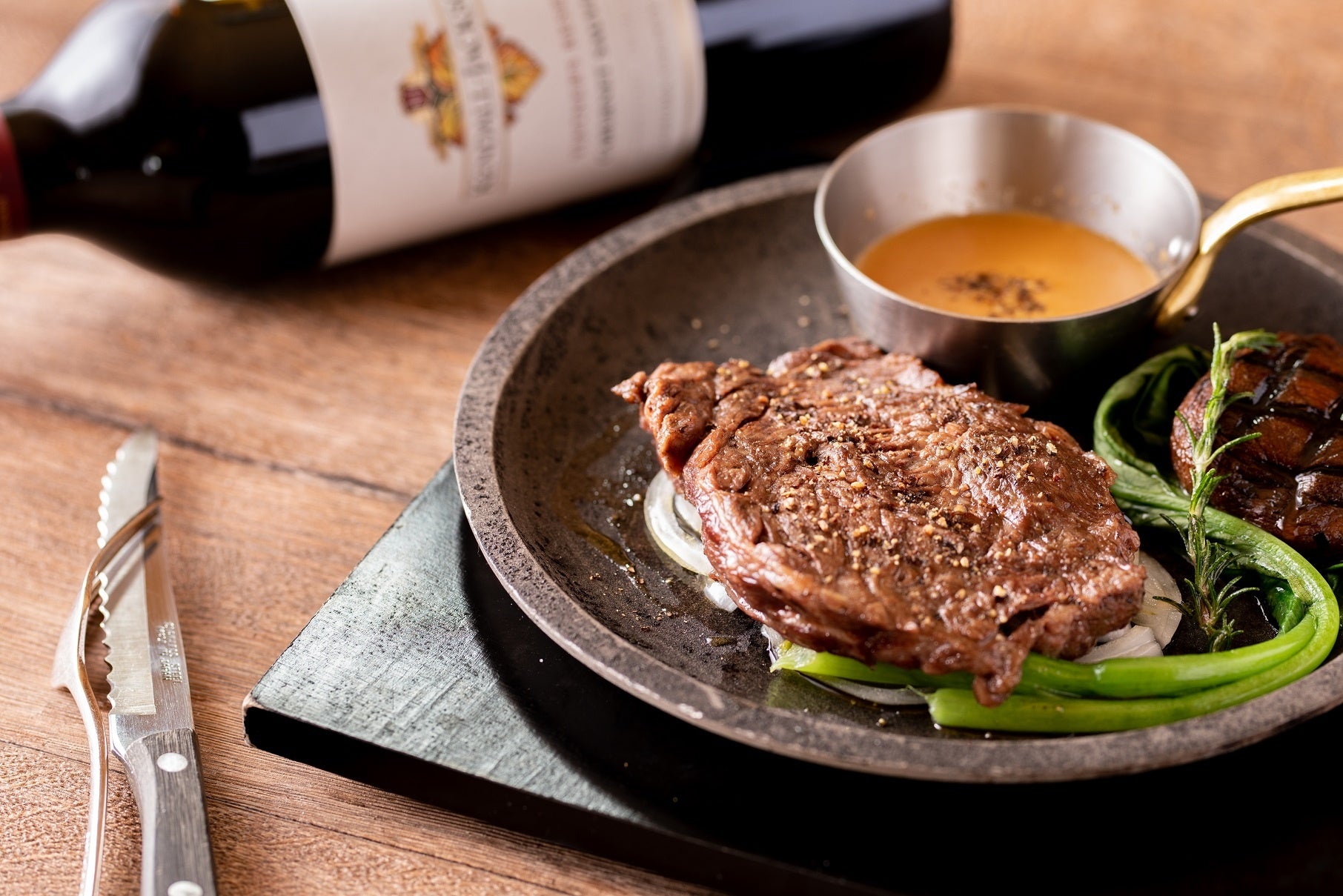 ■選べるメイン料理:炭焼きハンバーグ or炭焼き赤身肉の鉄板ステーキ(+300円)or宮崎牛ステーキ(+1,000円)