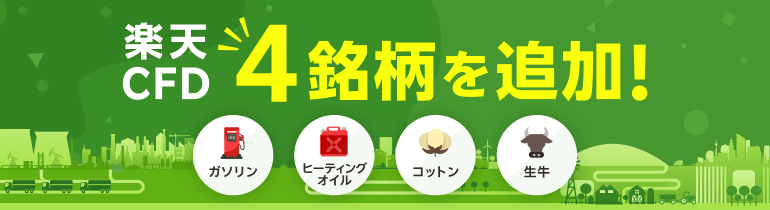 「楽天CFD」は、世界各国の株式指数やコモディティなどを原資産に、FX取引と同様にレバレッジを効かせ、証拠金の数倍の取引をすることができる差金決済取引、CFD取引サービスを、楽天証券のスマートフォン向けトレーディングアプリ「iSPEED®」や、パソコン向けトレーディングツール「MARKETSPEED II®」で取引ができるサービスです。このたび「楽天CFD」は、ヒーティングオイル(灯油)、ガソリン、コットン、生牛を原資産とする4銘柄を取扱開始します。これにより、代表的な株式指数から、生活のなかで馴染みのある商品に至るまで、より幅広い対象を原資産とする投資が可能になり、「楽天CFD」における商品CFDの取扱銘柄は業界最多(※1)の18銘柄となり、指数CFDなどとあわせて全42銘柄を提供します。取引銘柄の詳細は、楽天証券ホームページをご覧ください。https://r10.to/h5VcEb