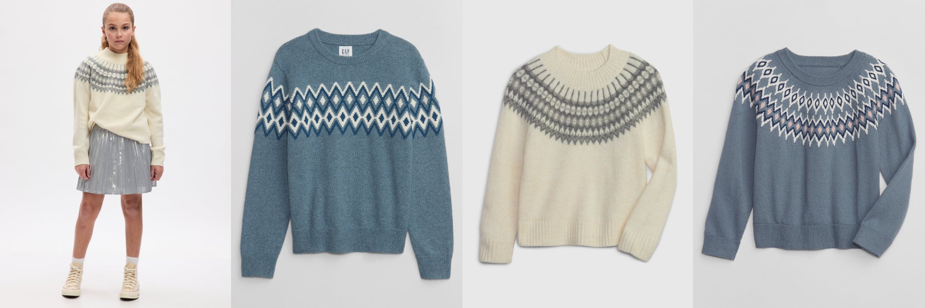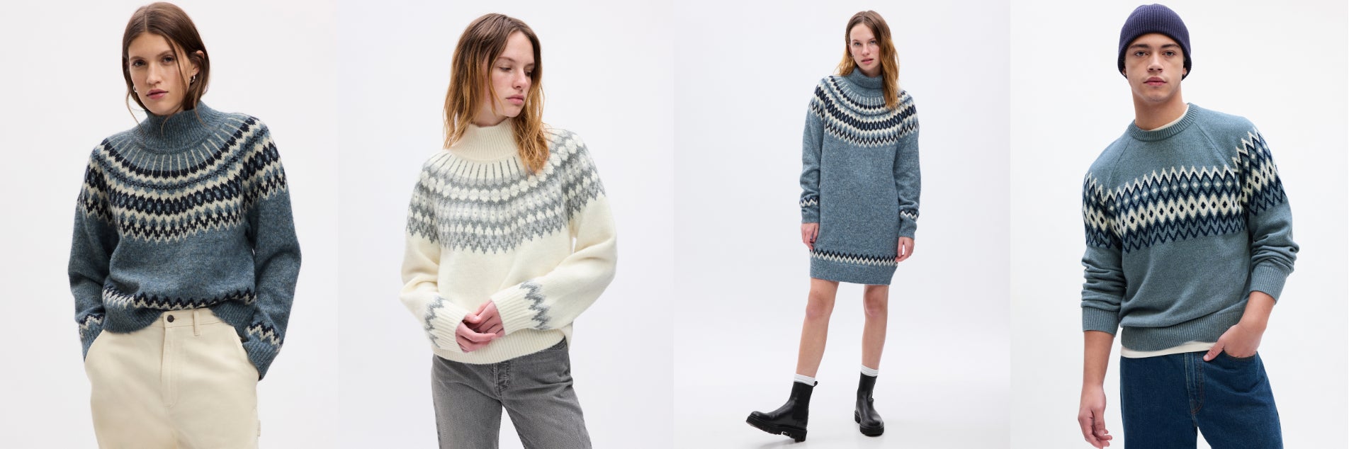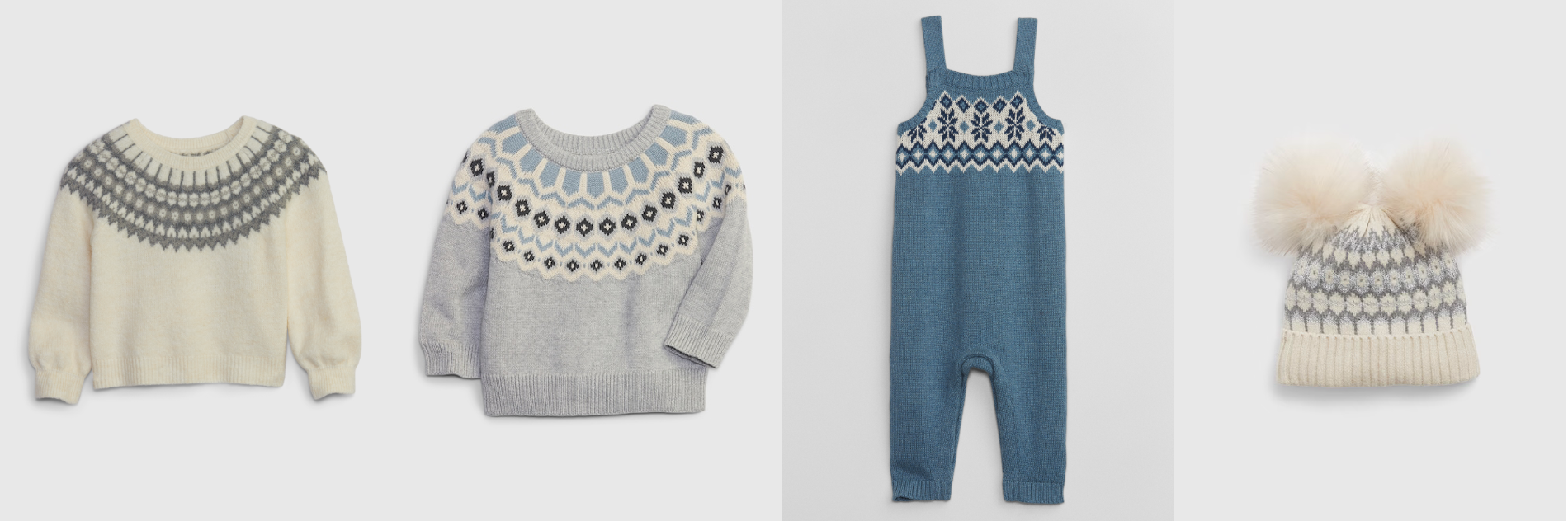 フェアアイルセーターは、ホリデーシーズンにぴったりなブルーやホワイトを基調としたカラーで登場します。ウィメンズは、モックネックトップスとタートルネックミニドレス、メンズはユニセックスで着られるクルーネックトップスを展開。ガールズはモックネックトップス、ボーイズ&トドラーガールズはクルーネックトップス、ベビーはクルーネックトップスとオーバーオールが揃います。また、靴下やニット帽、ミトンなどギフトにも最適なアクセサリーも充実し、全15型と豊富なラインナップでお届けします。