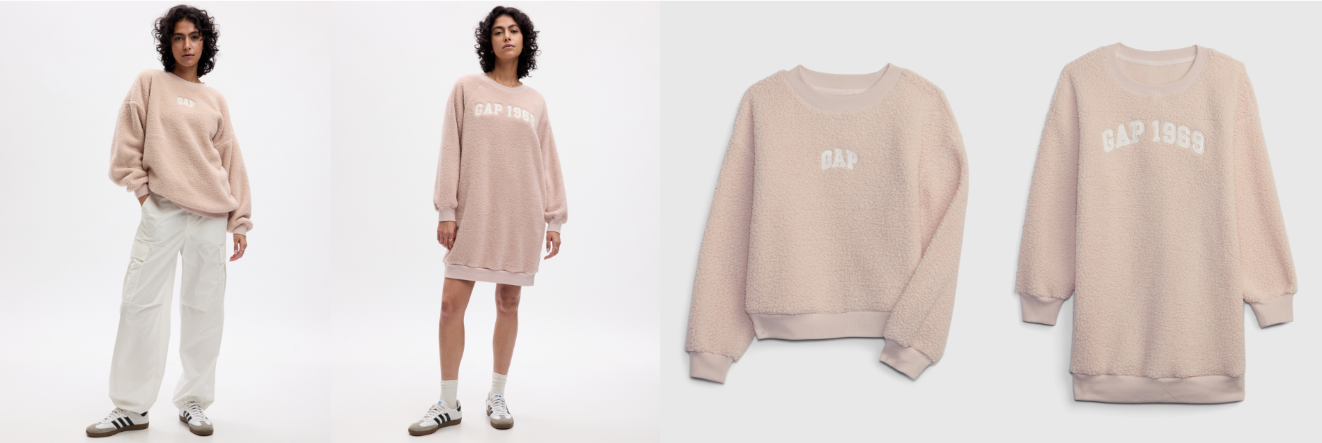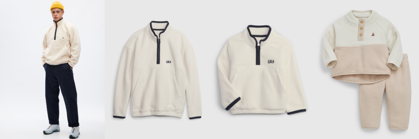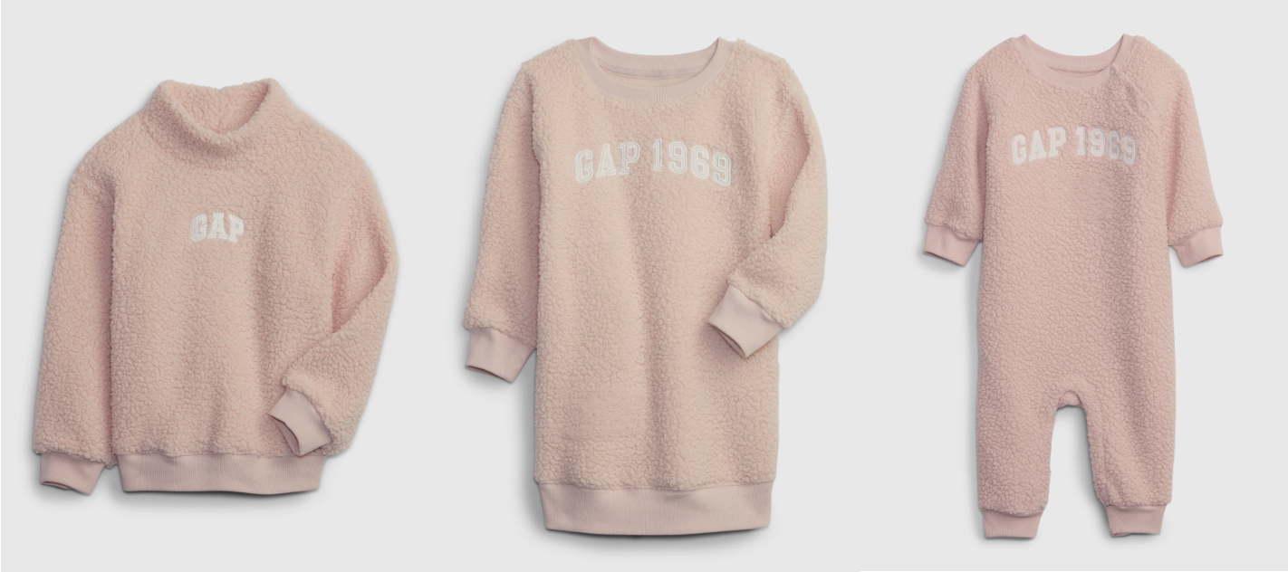 GAPロゴアイテムは、メンズ・ボーイズカテゴリーはARCTIC FLEECE素材、ウィメンズ・ガールズカテゴリーはシェルパ素材を使用しています。コージーで心地良いリサイクル素材を採用したARCTIC FLEECE素材は、トレンドであるハーフジップとパイピング加工が魅力です。シェルパ素材では、ウィメンズ、ガールズのクルーネックスウェットとミニドレスがラインナップ。トドラーガールズはモックネックスウェットとミニドレス、ニューボーンは足首まで暖かいカバーオールの全7型登場します。