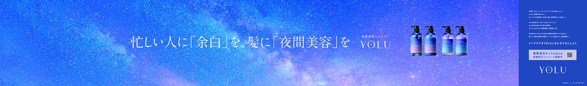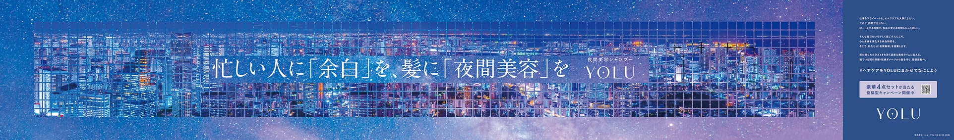 それを受けこの度、いつものヘアケアをYOLUに任せることで忙しい毎日に余白を作り、心と身体を労わる時間をより多くの方に体験してもらうキャンペーンを実施します。「忙しい人に『余白』を、髪に『夜間美容』を」というコピーとともに、YOLUのカームナイトリペアシャンプー/トリートメント、リラックスナイトリペアシャンプー/トリートメントのお試しパウチを受け取れるピールオフ広告を掲出いたします。