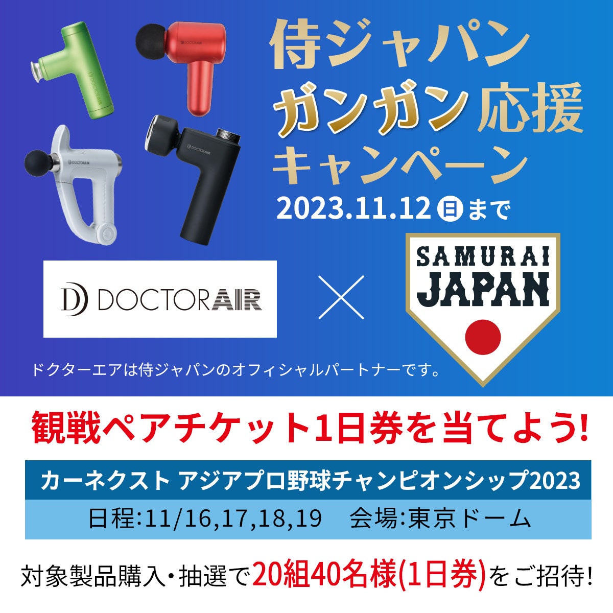 そして、今回の侍ジャパンオフィシャルパートナーへの就任を記念し、2023年11月6日(月)~11月12日(日)の期間で対象製品をご購入の方から抽選で「カーネクスト アジアプロ野球チャンピオンシップ2023」観戦チケットが当たる「侍ジャパン ガンガン応援キャンペーン」を実施いたします。
