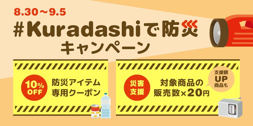 ソーシャルグッドマーケット「Kuradashi」を運営する株式会社クラダシ(本社:東京都品川区、代表取締役社長CEO:河村晃平、以下「クラダシ」)は、9月の防災月間に合わせて、「#Kuradashi 防災キャンペーン」を開催いたします。食品・飲料・日用品など、もしもの災害時に備えになるようなアイテムをあつめた特集をKuradashiサイト内で公開するほか、期間中、防災特集内の対象商品販売数1点につき20円をピースボート災害支援センターを通じて能登半島地震緊急支援へ寄付いたします。