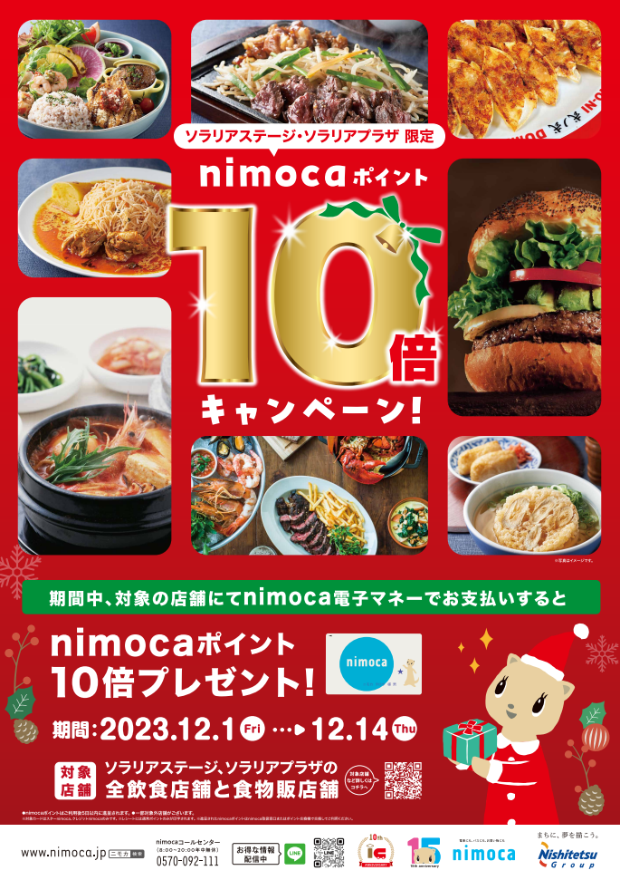 対象期間中、ソラリアステージ・ソラリアプラザの飲食店舗・食物販店舗にて、nimoca電子マネーでお支払いいただいた方を対象に通常の10倍のnimocaポイントを進呈いたします。