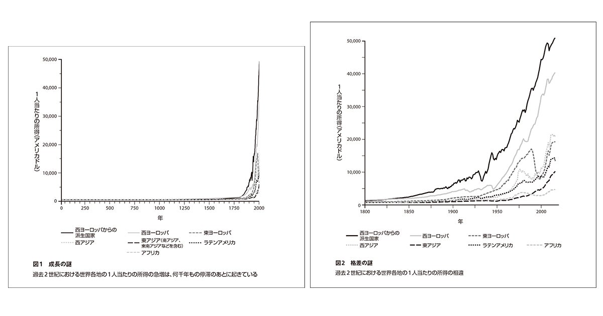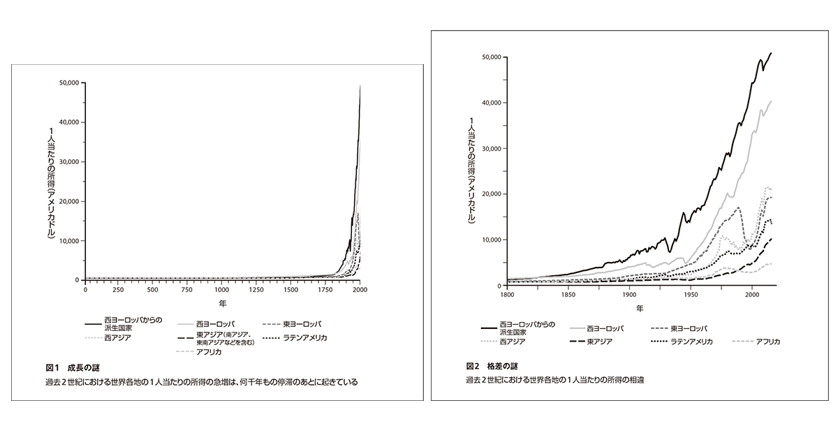 また、人類は19世紀以降に経済成長を果たしたものの、その歩みは一様ではなかった。図2は、過去2世紀における世界各地の1人当たりの所得の相違を示している。西ヨーロッパ諸国と、北アメリカやオセアニアなど西ヨーロッパから派生した国の一部では、早くも19世紀に生活水準が飛躍的に向上したが、アジア、アフリカ、ラテンアメリカのほとんどの地域では20世紀後半になってようやく向上が見られた。これが今日の経済格差となって表れている。