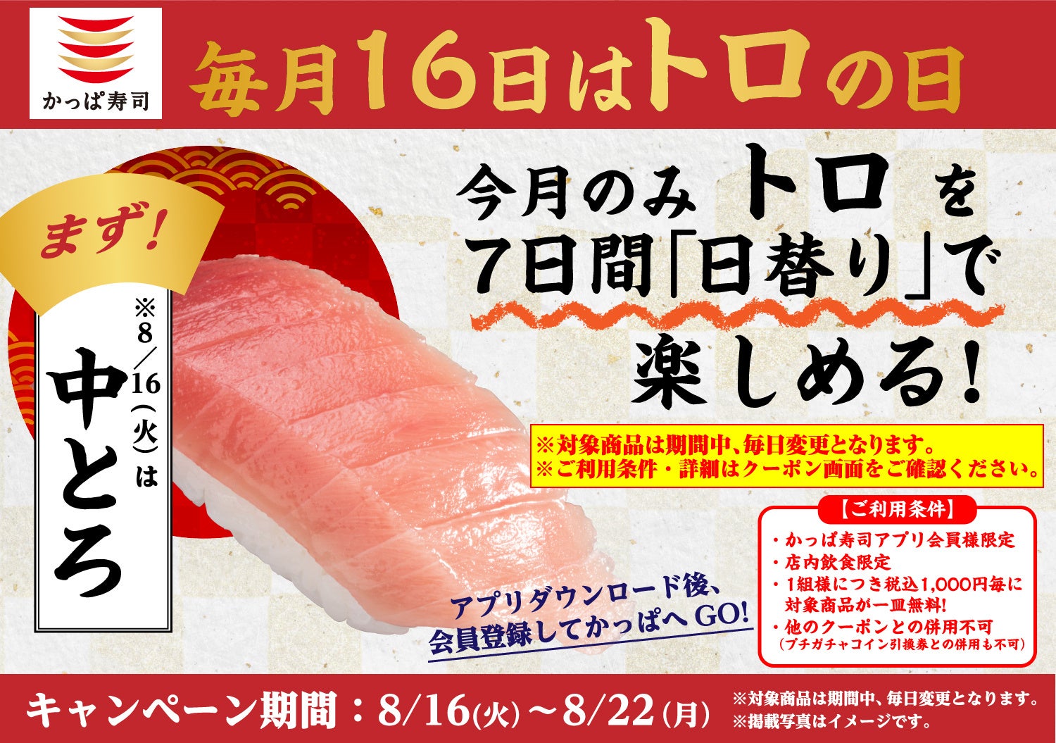 夏休み後半のかっぱ寿司をまだまだ楽しんでいただきたく、かっぱ寿司「トロの日」キャンペーンが復活いたします!しかも、今回は8月16日(火)から8月22日(月)の7日間を「トロの日」ウィークとし、期間中毎日「日替わり」の“トロ”ネタをアプリ会員様へ1,000円(税込)ごとに一皿プレゼントいたします。