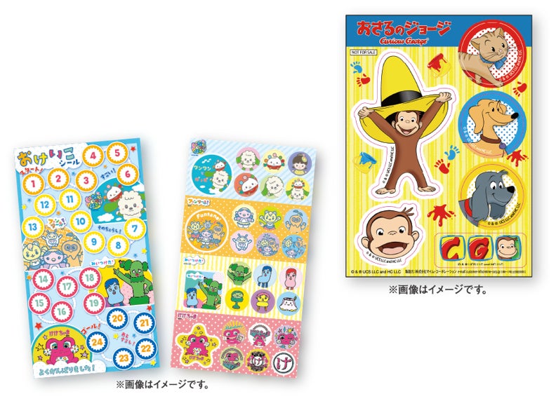 4月25日(金)から5月29日(木)の期間中、それぞれのフェアごとに対象商品を含む3,300円(税込)以上ご購入いただいた方に、「Eテレキャラクター」フェアから『おけいこシール』、「おさるのジョージ」フェアから『おさるのジョージ』ステッカーシートをプレゼントいたします!