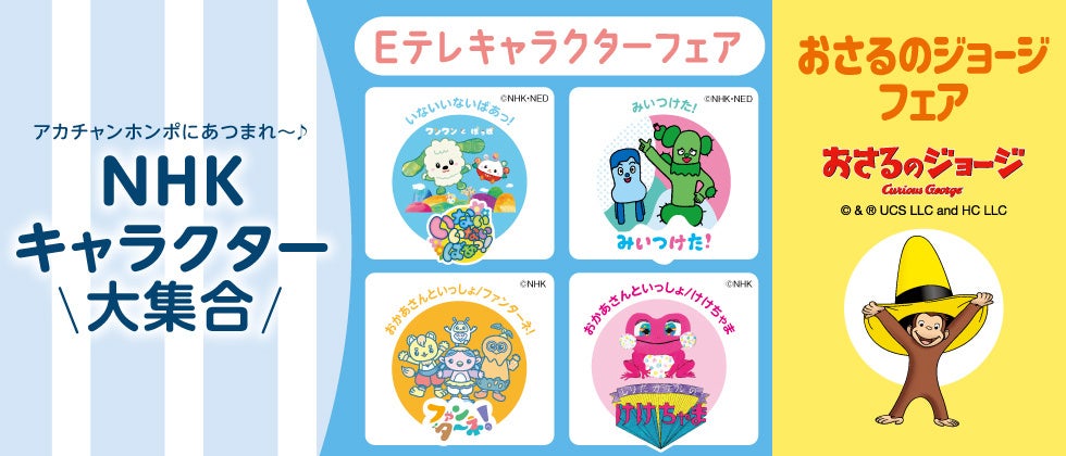 株式会社赤ちゃん本舗(本社:大阪市中央区 https://www.akachan.jp)は、2025年4月25日(金)から2025年5月29日(木)まで『Eテレキャラクター』フェア・『おさるのジョージ』フェアを、全国のアカチャンホンポとオンラインショップ(https://shop.akachan.jp)で開催いたします。