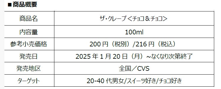 森永製菓株式会社(東京都港区芝浦 代表取締役社長・太田 栄二郎)は、しっとり・もちもち食感のクレープ生地のクレープアイス『ザ・クレープ』ブランドより、「ザ・クレープ<チョコ&チョコ>」を2025 年1月20日(月)より期間限定で新発売いたします。