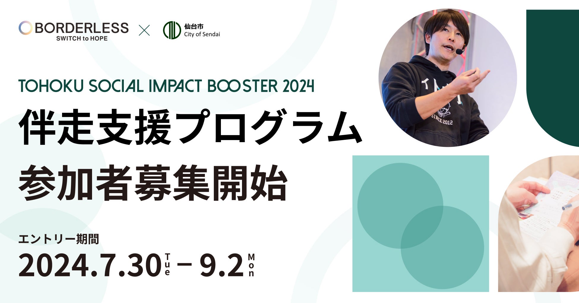 株式会社ボーダレス・ジャパン(所在地:福岡県福岡市、代表取締役:⽥⼝⼀成、以下:当社)は、2024年6月より仙台市から受託している「令和6年度 ソーシャル・インパクト加速化事業」において、仙台・東北の社会起業家の「ソーシャル・インパクトの拡大」と「事業拡大」を目指した伴走支援プログラム「TOHOKU SOCIAL IMPACT BOOSTER」の本エントリーを2024年7月30日(火)より開始します。エントリーの開始に合わせて、特設サイトもリリースしております。
