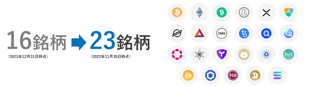 GMOコインは1年間で新たに7銘柄を追加、取扱銘柄数は国内最大級の23銘柄となりました。