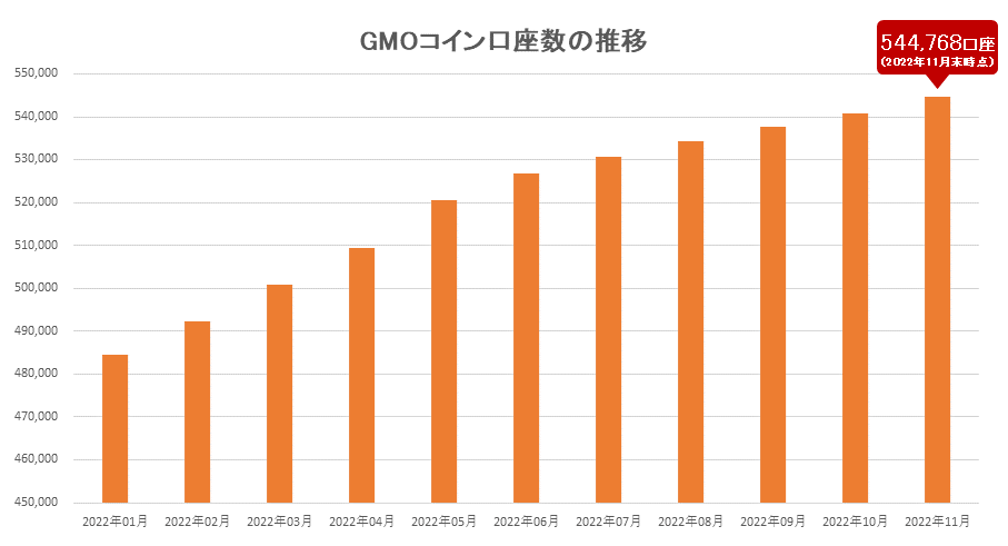 GMOコインの口座数は堅調に推移し、11月末時点で54万口座を突破。2022年の1年間で新たに約7万口座が開設されました。