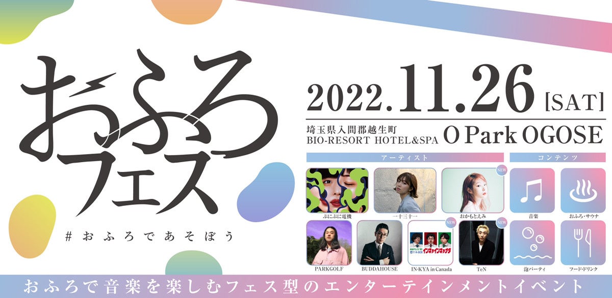 株式会社温泉道場(埼玉県比企郡ときがわ町、代表取締役 山崎寿樹)が運営する「BIO-RESORT HOTEL&SPA O Park OGOSE」(以下、オーパークおごせ)は、2022年11月26日(いい風呂の日)に開催する、おふろ×音楽をテーマにしたイベント「おふろフェス」の参加第二弾アーティストおよびタイムテーブルを公開しました。