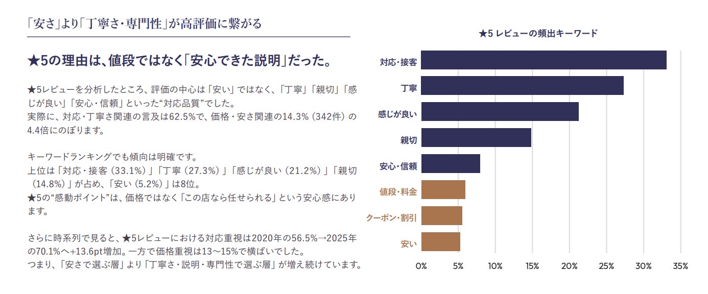 クチコミを分析した結果、割引の多さや立地の良さ以上に、受付時のコミュニケーションやプロとしての丁寧な説明が、店舗の評価を大きく左右していることが分かります。