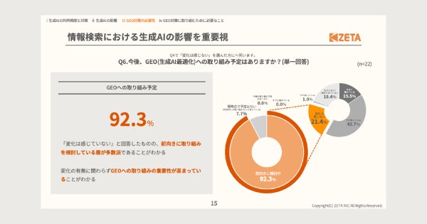 本調査内で「生成AI経由のWeb流入」に関して「変化は感じない」を選択した回答者のうち、「前向きに検討中」が92.3%、「現時点で予定はない(将来的には取り組みたいと考えている)」が7.7%という結果となりました。