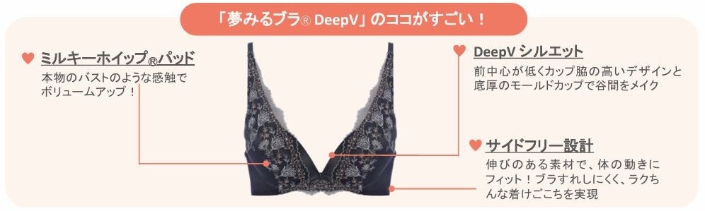 取り外し可能なミルキーホイップⓇパッドが、本物のバストのような感触でボリュームアップ!胸もとはシャープなV字のデコルテラインですっきりとした印象に。底厚で、サイドは高さのあるモールドカップがバストを前中心に集め、きれいな谷間をメイク。カップ下のサイド部分には伸びのある素材を使用しているので、ブラずれしにくく、ラクちんな着けごこちです。