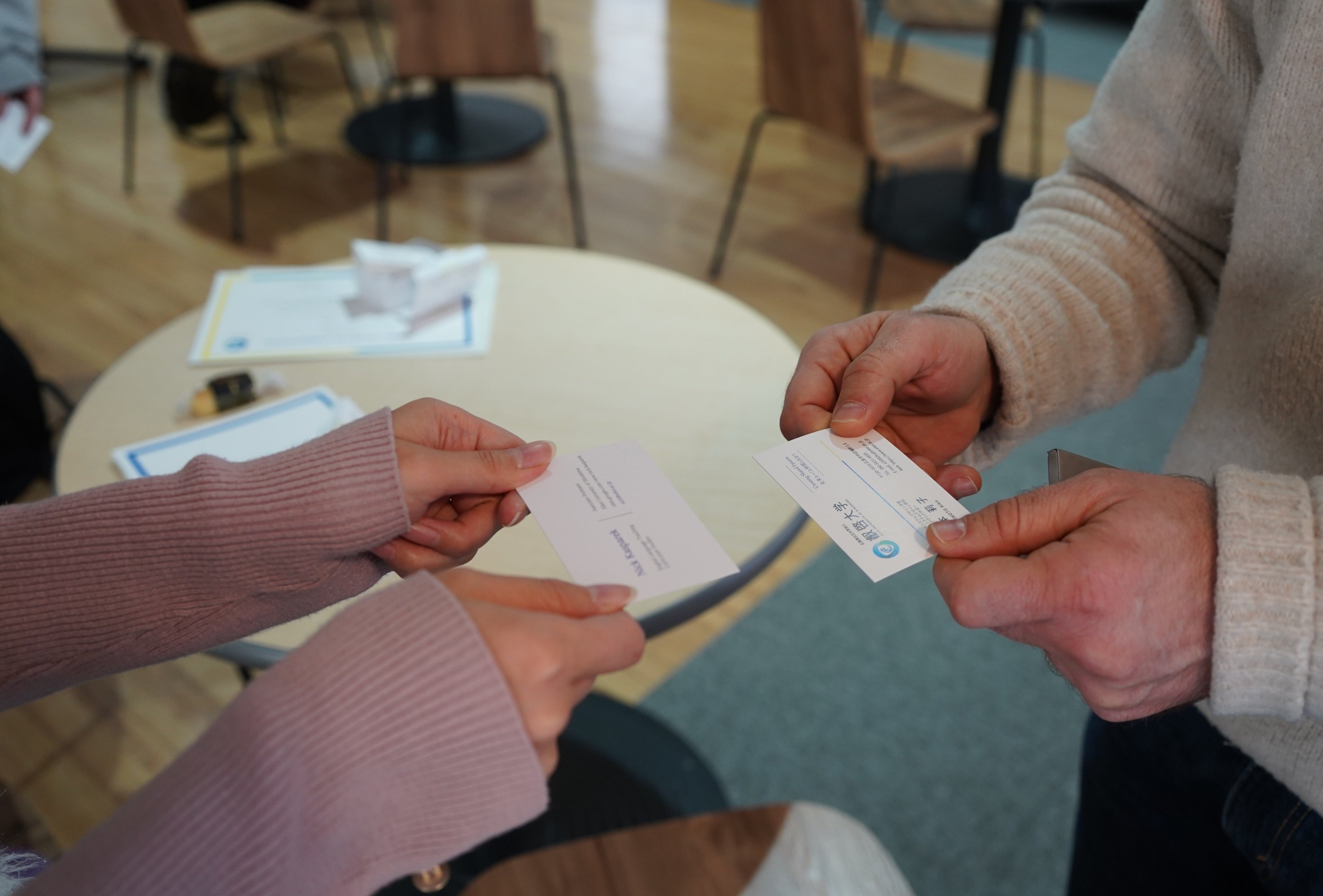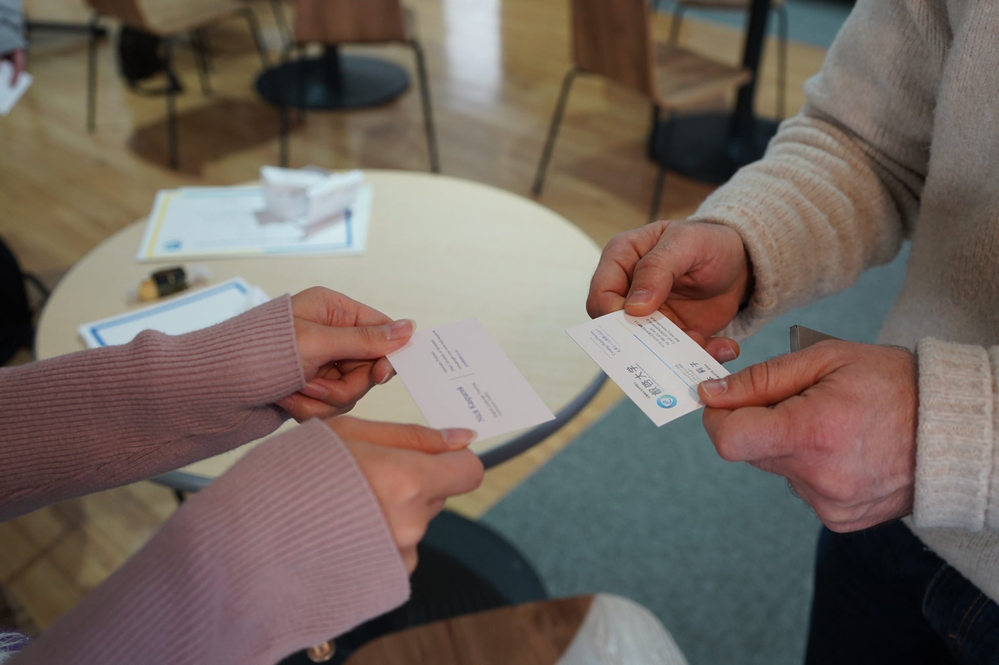 研修会後には、学生ブランドアンバサダーとしての名刺が配布され、早速名刺交換の練習に挑戦する姿も見られました。少し緊張しながらも笑顔で自己紹介を交わす様子からは、学生ブランドアンバサダーとしての実感が芽生えていることが伝わってきました。