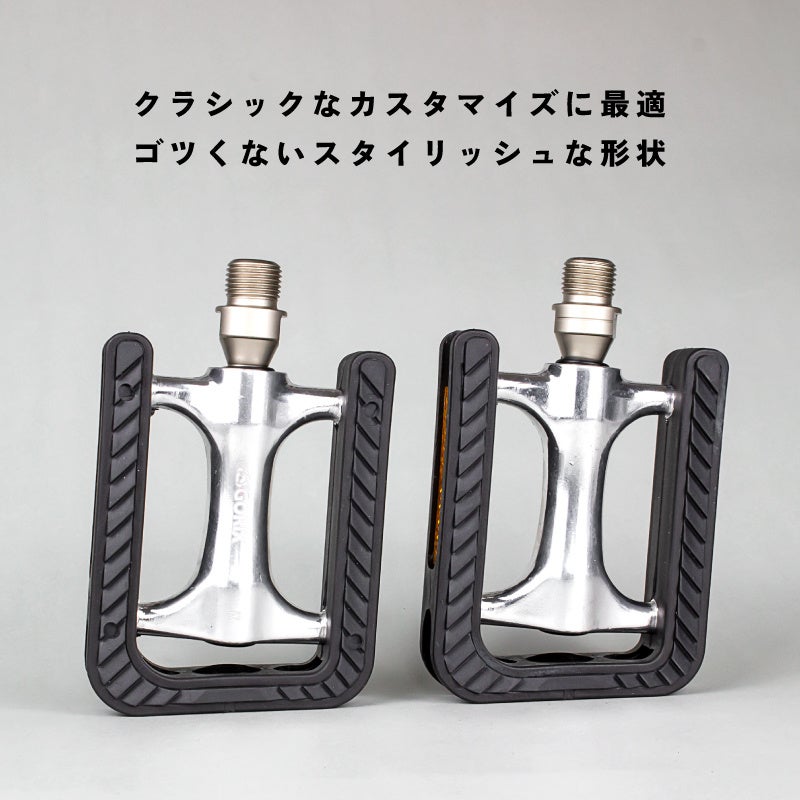 耐久性があり軽量なアルミ素材で、とても実用的なペダルです。スムーズに回るベアリングは引っ掛かりがなく快適なペダリングを可能にします。クラシックな感じに仕上げるカスタマイズのペダル交換に最適です。