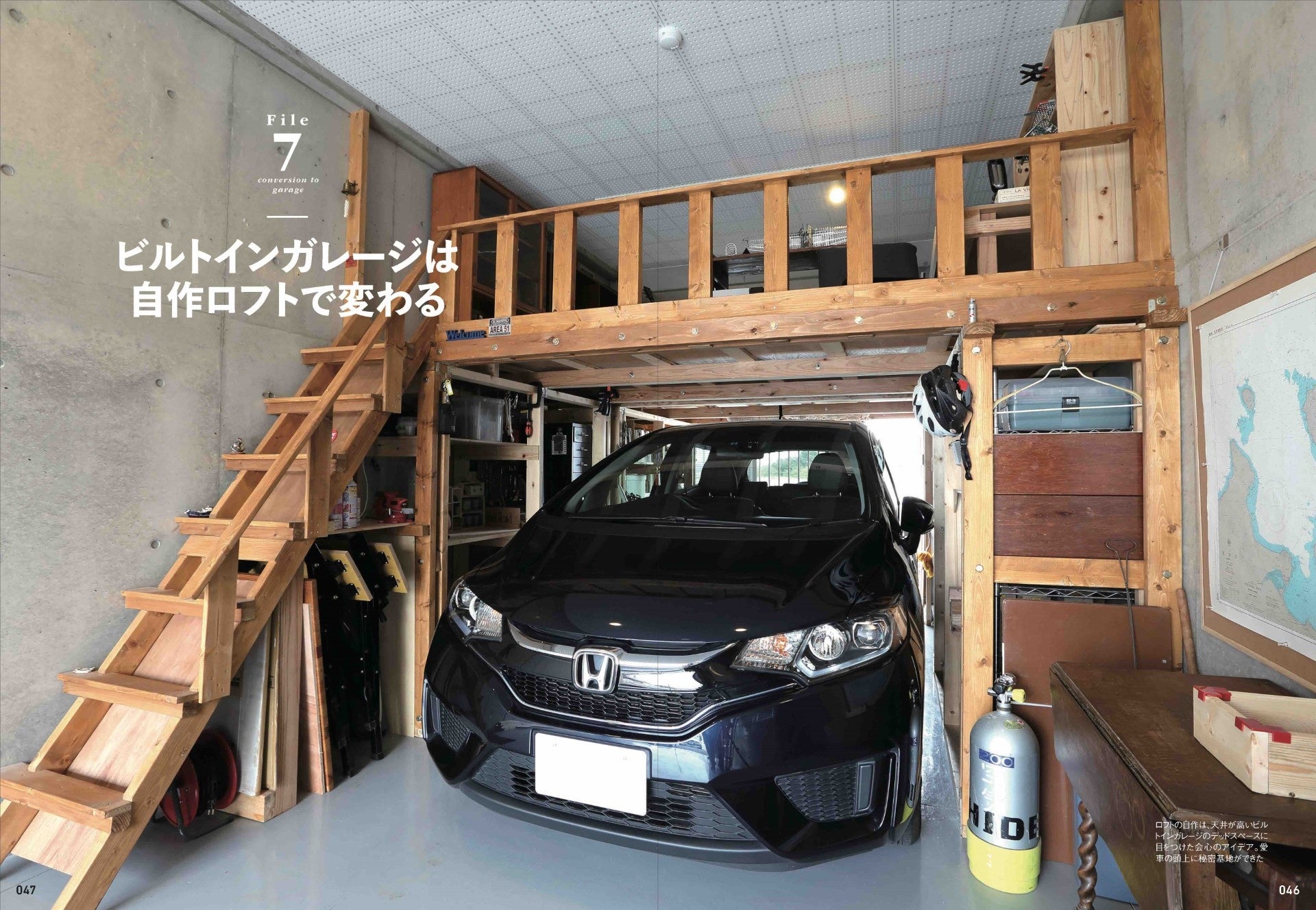 また、ビルトインガレージを大幅にアレンジしたものも、手作りガレージといえます。たとえば、愛車が収まるようにロフトを作り、作業スペースや収納スペースを創出したガレージなどを本書では紹介しています。