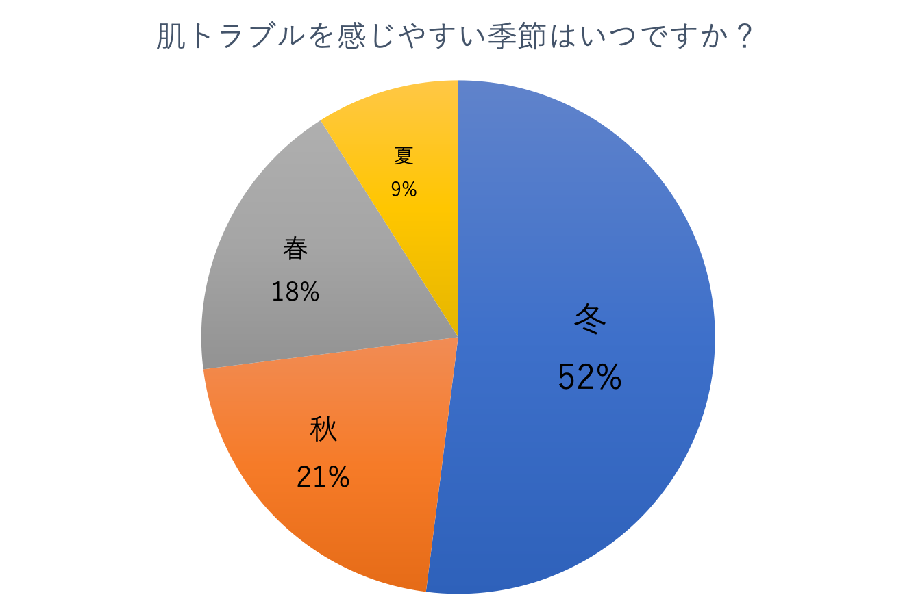 という結果になりました。空気の乾燥が気になる冬のシーズンが一番肌トラブルが多く、続いて乾燥し始める秋もトラブルが多いという結果でした。3位の春は花粉症のシーズンということもあり、一部の方にとっては肌トラブルが出やすい傾向にあり、夏が一番トラブルは少ないという結果が出ました。