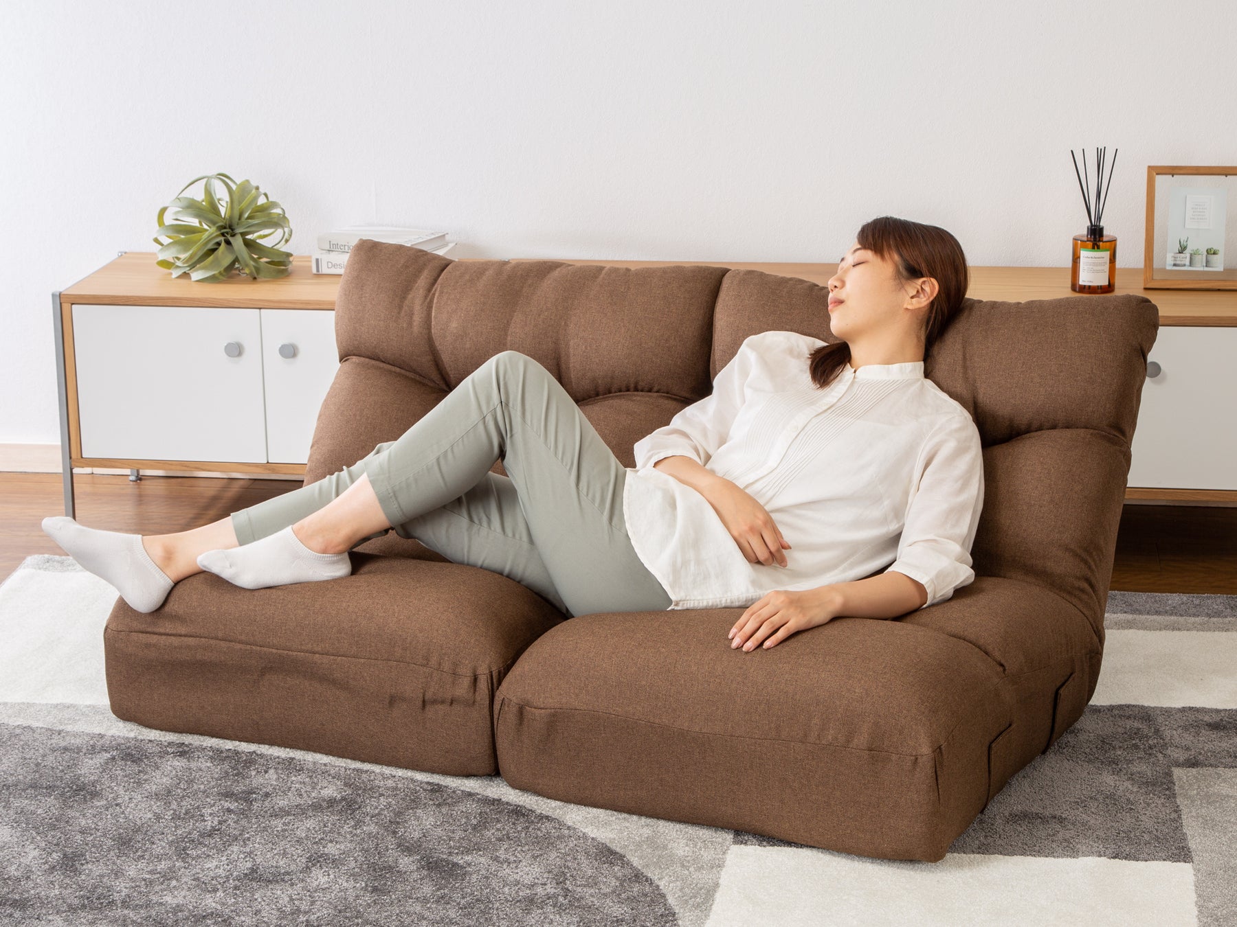 また、サイドの面ファスナーを使えば簡単に2台をつなぐことができ、さらにゆったり2人用ソファのようにもお使いいただけます。座イスなので、背もたれの角度はもちろんお好みに調整可能。ソファに比べ動かしやすく、掃除もラク。