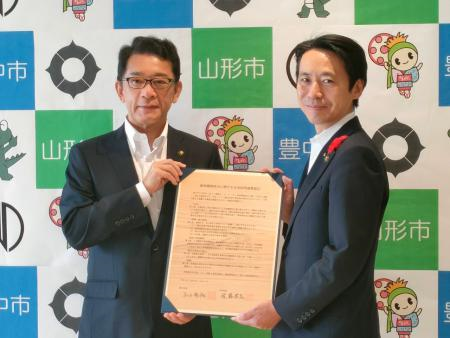 協定書を掲げる長内繁樹市長と山形市・佐藤孝弘市長