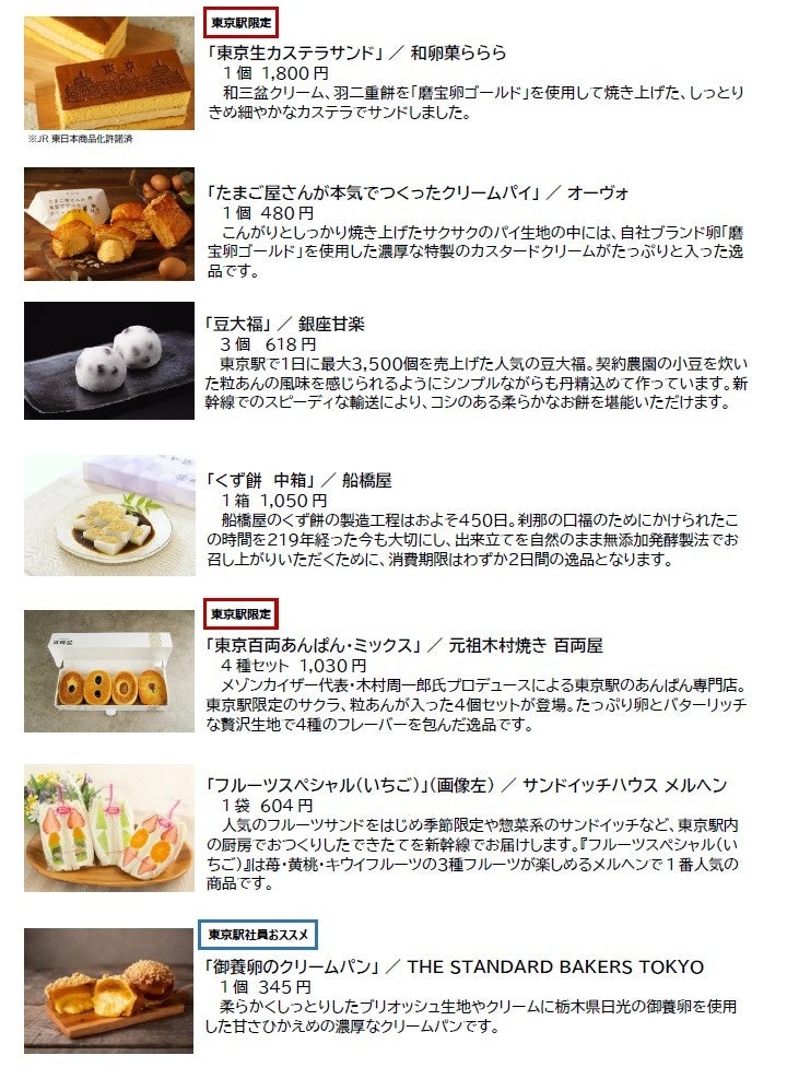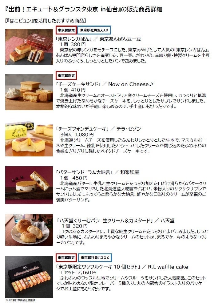 エキュートやグランスタ東京で人気の菓子やサンドイッチなど、81商品を販売します。一部商品は、東北新幹線を使用した列車による荷物輸送サービス「はこビュン」を活用します。