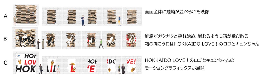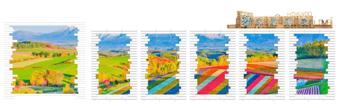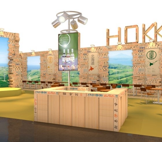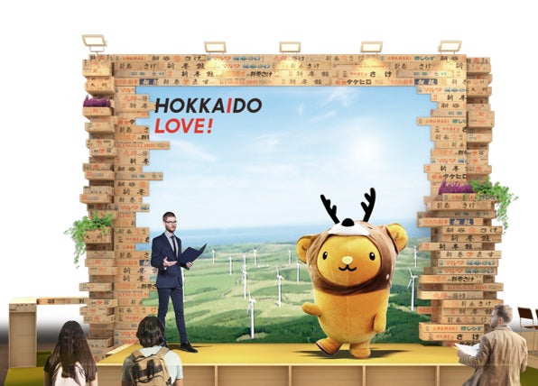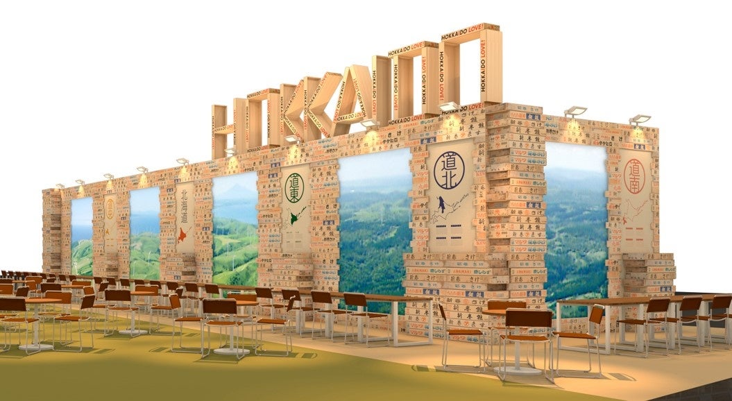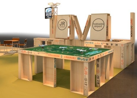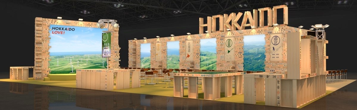 そのために、情報量が多くイメージを伝えやすい大型ビジョンを複数基設置し、動画コンテンツで来場者に魅力を伝えます。そして、そこに北海道らしさを感じられる鮭箱を装飾することで、異質と異質の組み合わせで生まれるインパクトのある、思わず誰かに伝えたくなるブースを作りたいと考え、このデザインを制作致しました。圧倒的なスケールとなるブースで、従来の北海道の魅力に加え、近年新しく誕生したコンテンツも紹介し、アップデートされた北海道を圧倒的に表現します。
