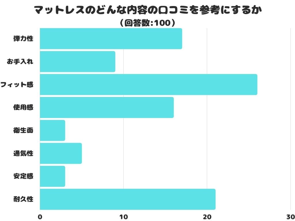 ・どれだけ自分の体に合っていて、硬過ぎず、柔らか過ぎずちょうど良いマットレスを選べるかという部分を参考にします。(女性20代)
