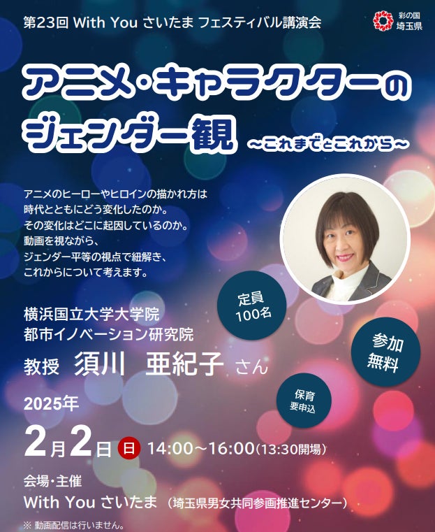 2月2日(日曜日)の須川亜紀子さんによる講演会「アニメ・キャラクターのジェンダー観 ~これまでとこれから~」は事前申込が必要となります。電子申請でお申込みください。