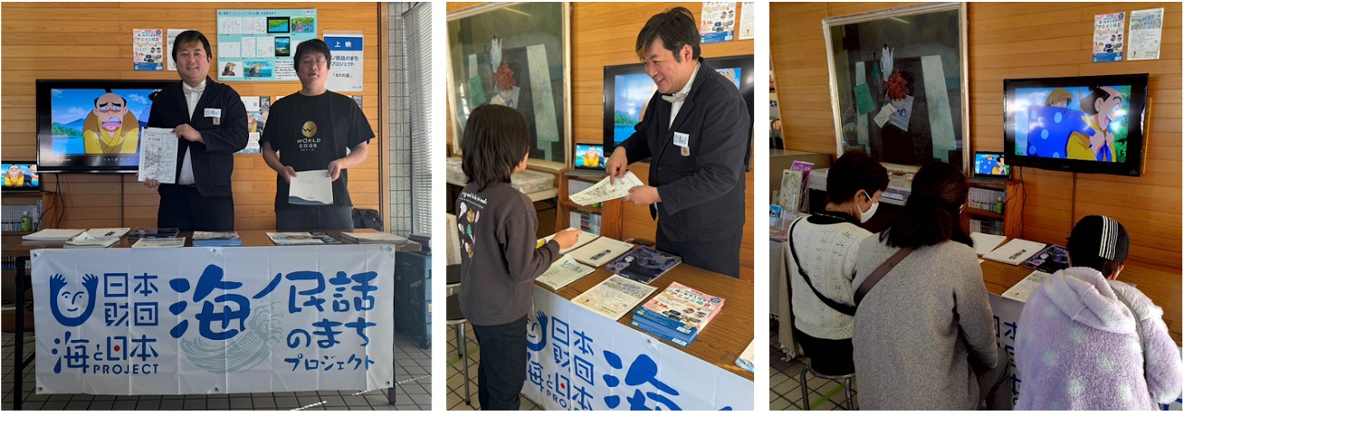 メインホールで行われたオープニングセレモニーでは、完成した海ノ民話アニメーション『カミの話』が初めて上映されました。会場は温かな笑顔に包まれ、作品が持つ不思議な魅力が来場者の心を一気に引き込みました。ワークショップ会場の特設ブースでは、アニメ本編の上映に加え、貴重な絵コンテなどアニメ制作の舞台裏を紹介する資料を展示。会場には沼田監督も駆けつけ、自ら制作の意図やアニメの背景を解説する場面も見られ、訪れた人々は熱心に耳を傾けていました。作品を鑑賞した方々からは、そのユーモアあふれる展開に、「くすくす」と楽しげな笑い声が漏れ聞こえてきました。アニメという親しみやすい形になったことで、子どもから大人まで、楽しみながら地域の文化と歴史に触れたひとときとなりました。