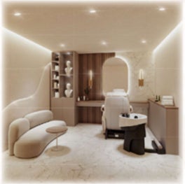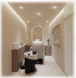 サロン内は、ホワイトを基調にゴールドをアクセントカラーとしてあしらい、シルクや大理石といった、上質で洗練された素材をふんだんに使用。全室個室ブースを設置し、ゆったりとおくつろぎいただける空間をご用意いたしました。さらに、レディースアートネイチャーの中で唯一、本サロンだけにVIPルームを併設。旗艦店にふさわしい特別なひとときをお過ごしいただけます。