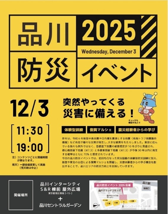 日鉄興和不動産株式会社(本社:東京都港区、代表取締役社長:三輪 正浩)と、品川インターシティマネジメント株式会社(本社:東京都港区、代表取締役社長:小津 正臣)は、品川インターシティS&R棟前の屋外広場および品川セントラルガーデンにて、「品川防災イベント2025」を12月3日(水)に開催いたします。