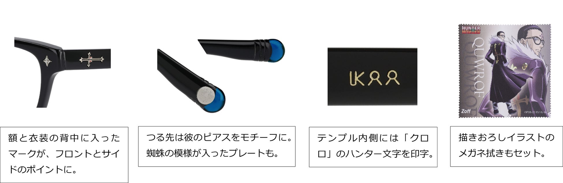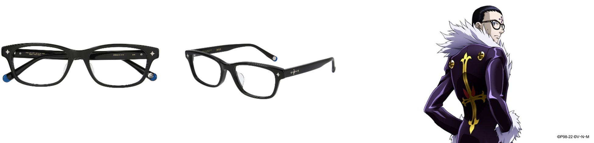 クロロの額と背中に入ったマークをフロントやサイドにあしらった、黒縁ベースのフレーム。彼のピアスをイメージしたテンプル(つる)エンドには、蜘蛛のプレートが光る。一見クールな反面、ポイントに華もあるデザイン。