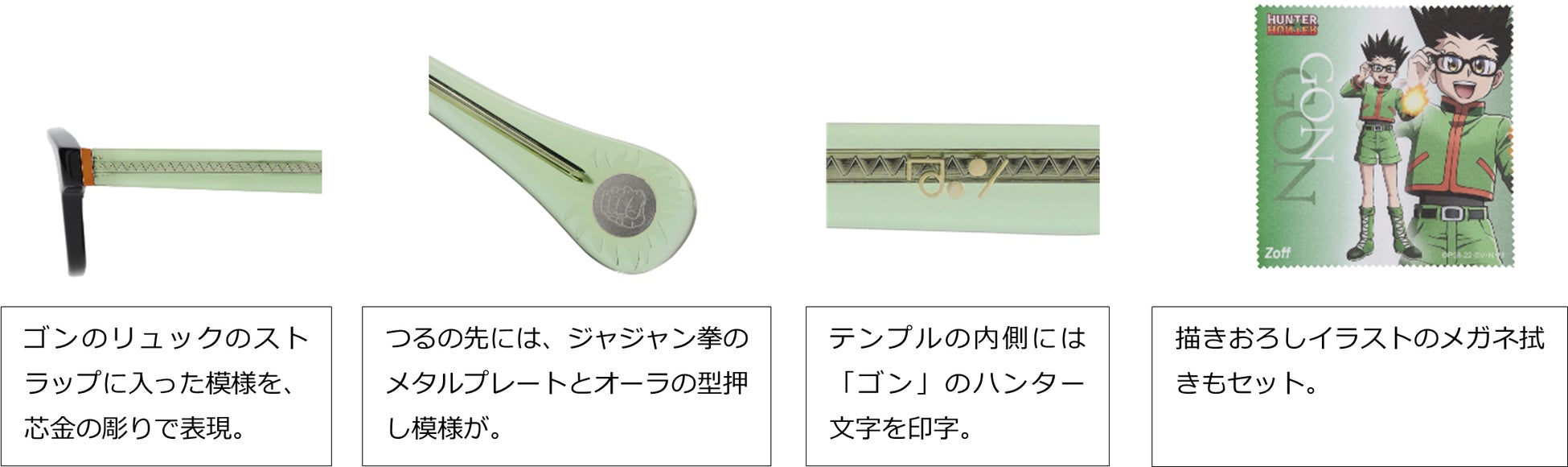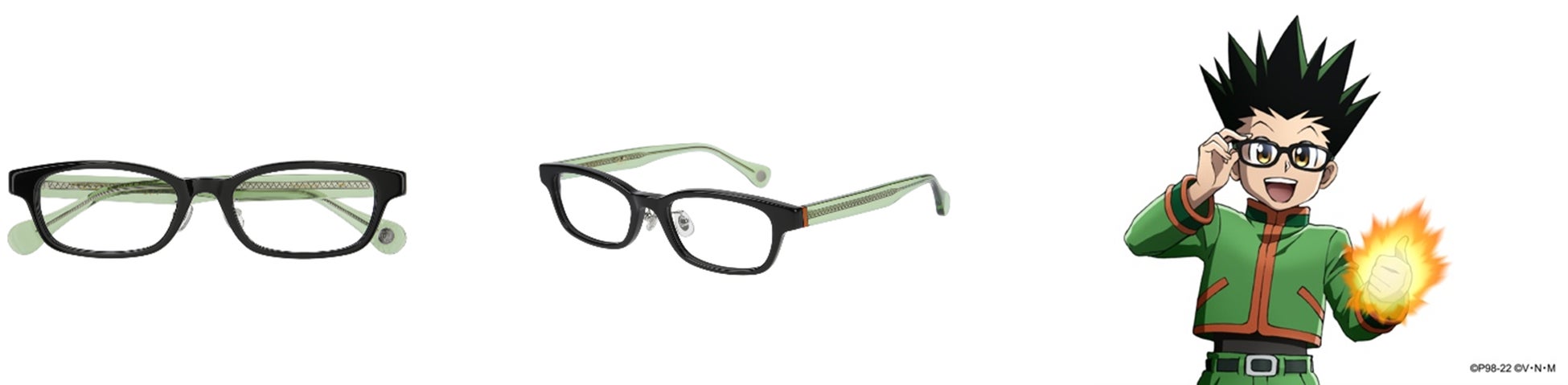 ゴンの衣装を、テンプル(つる)のカラーと芯金の模様で表現。テンプルエンド(つるの先)にはジャジャン拳のメタルプレートや、オーラをイメージした模様があしらわれている。シンプルなスクエア型で、年代を問わずかけやすいフレーム。