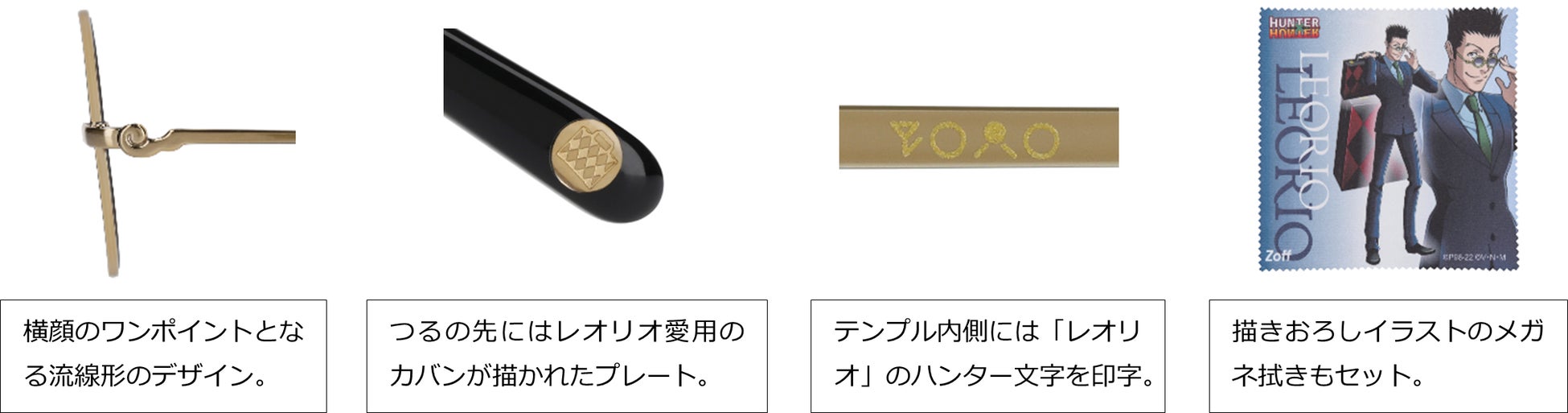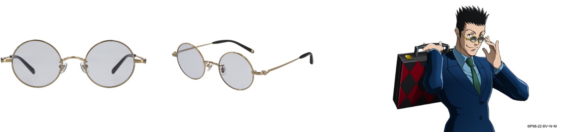 レオリオが作中でいつもかけているサングラスを、日常的に使いやすいサイズ感で忠実に再現。テンプル(つる)には、さりげなくワンポイントデザインを加え、テンプルエンド(つるの先)にはカバンのプレートが埋め込まれている。※こちらは度なし専用商品(サングラス)です。