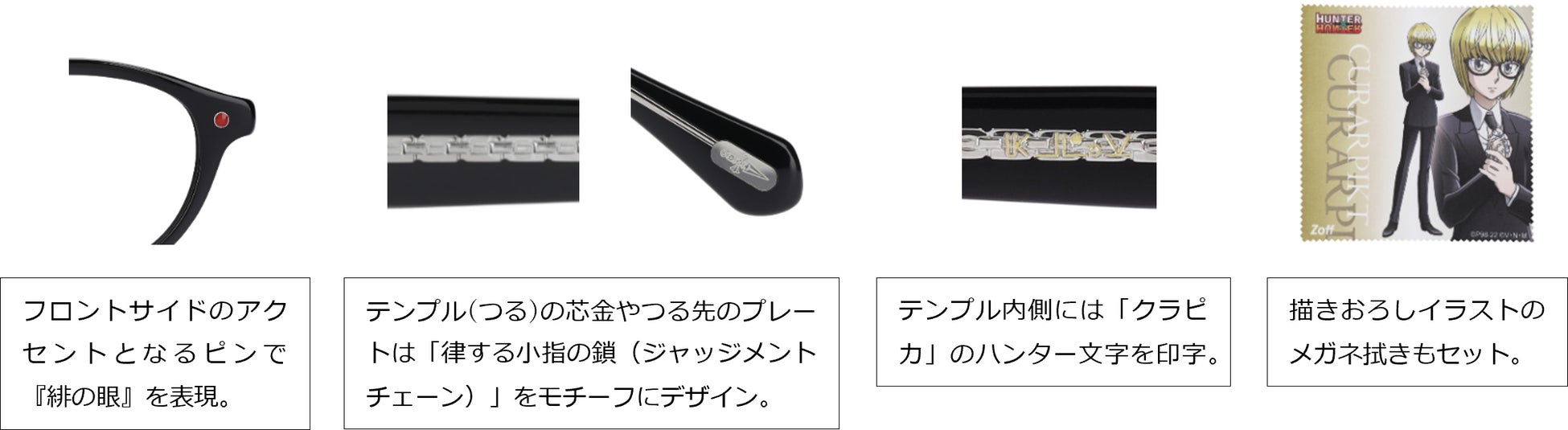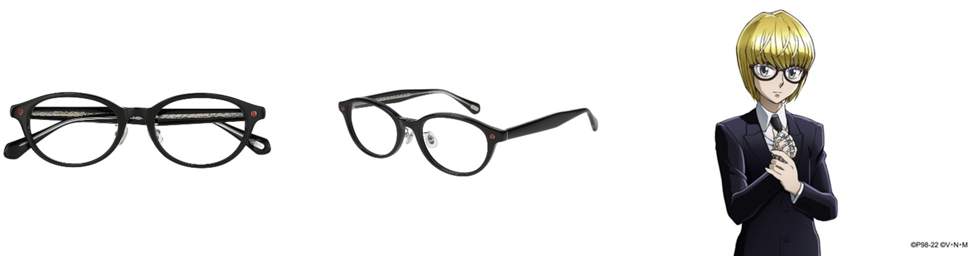 クルタ族ならではの『緋の眼』をフロントサイドに表現。テンプル(つる)の内側に見える芯金とテンプルエンド(つるの先)のプレートは、念能力がモチーフになっている。シンプルなカラーリングとデザインで、ユニセックスで使いやすいフレーム。