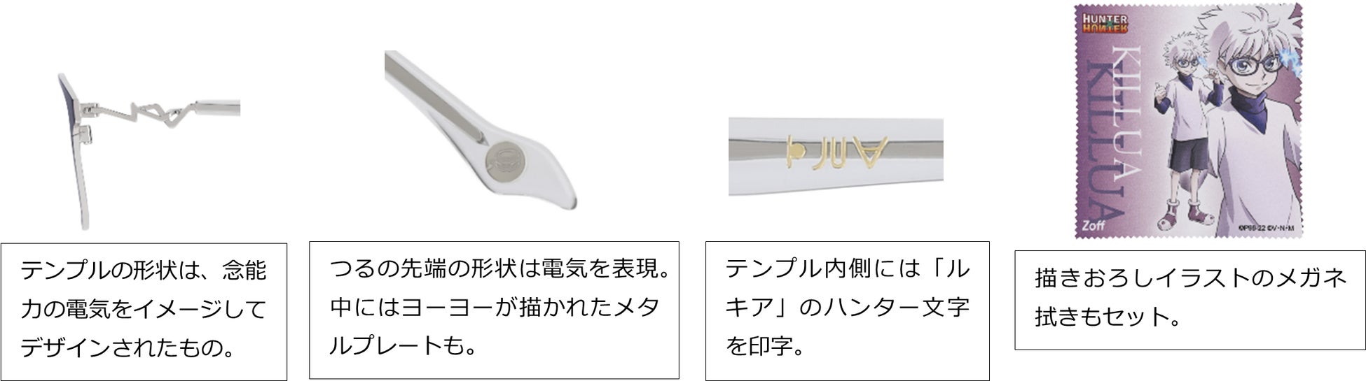 キルアの念能力からインスパイアされた、電気をイメージしたテンプル(つる)が特徴的。テンプルエンド(つるの先)も電気を模した形をしており、ヨーヨーのメタルプレートが埋め込まれている。細身で繊細さも感じさせるデザイン。