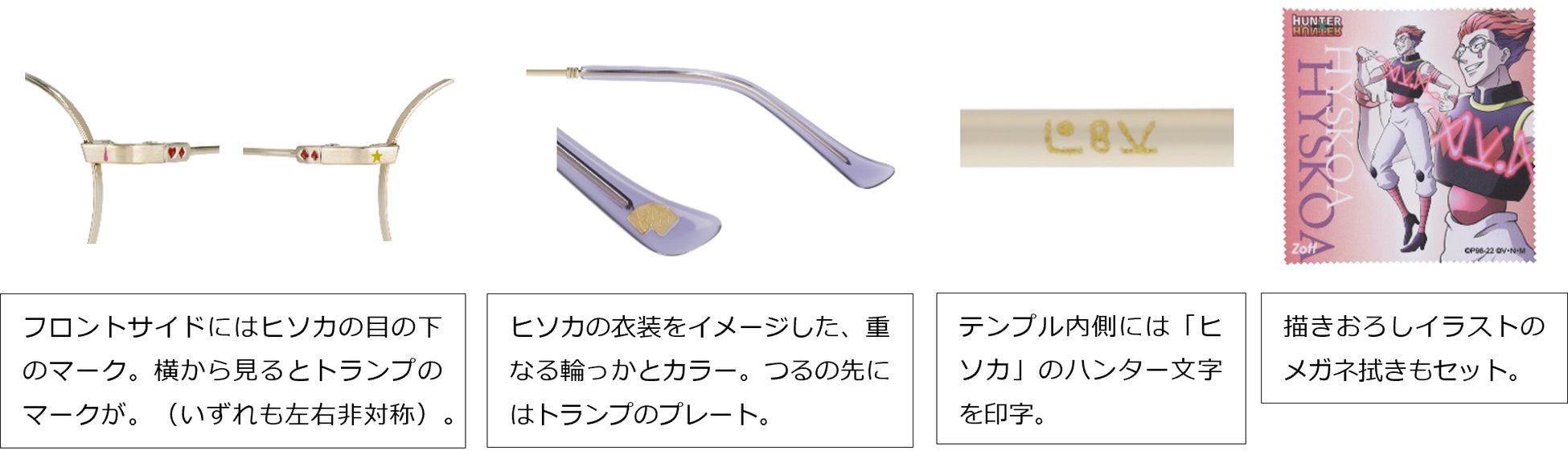 ヒソカの顔の模様やトランプマークを随所にデザイン。テンプル(つる)は念能力「伸縮自在の愛(バンジーガム)」をイメージしたフォルムになっており、テンプルエンド(つるの先)にも工夫が光る。オンタイムにも使いやすいメタルフレームタイプ。