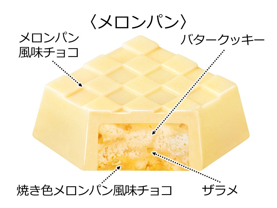 メロンパン風味チョコの中にバタークッキーとザラメを入れ、メロンパンのサクサク部分を再現しました。ボトムには、焼き色メロンパン風味チョコを使用し、パンの小麦感や焼かれた時の香ばしさを出しています。