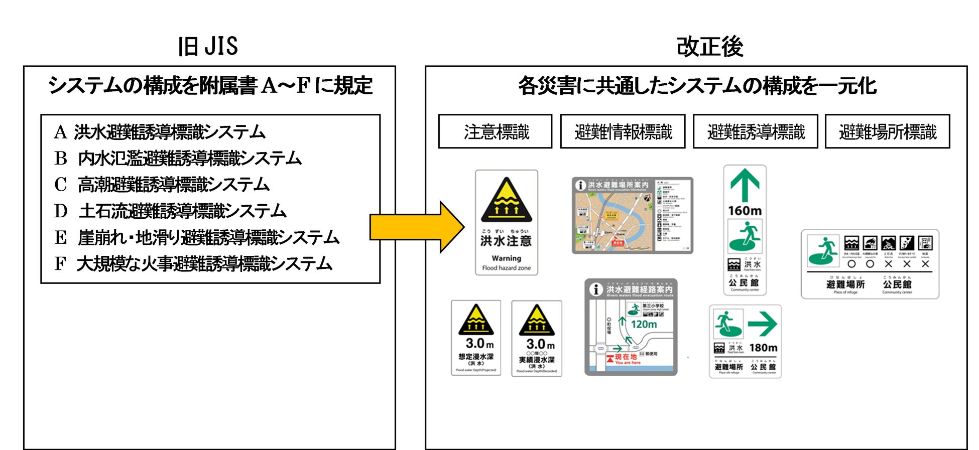 避難誘導標識システムは4種の標識によって構成されていますが、これまでは自然災害の種類ごとにその構成や記載例、設置例を規定しており、規定内容の重複が多く生じていました。そのため、規定内容の重複を解消し、各標識に求められる要件を分かりやすく表現することを目的として、全ての災害種別に共通する避難誘導標識システムの構成要件を統一して規定しました。