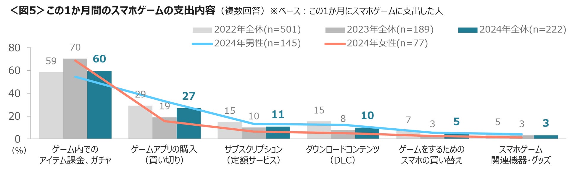 この1か月の間にスマホゲームにお金を使った人のうち、具体的な支出内容は、「ゲーム内でのアイテム課金、ガチャ」が60%と多く、「ゲームアプリの購入(買い切り)」27%、「サブスクリプション」11%と続く。「ゲーム内でのアイテム課金、ガチャ」は女性で、「ゲームアプリの購入(買い切り)」は男性が多い結果となった。<図5>
