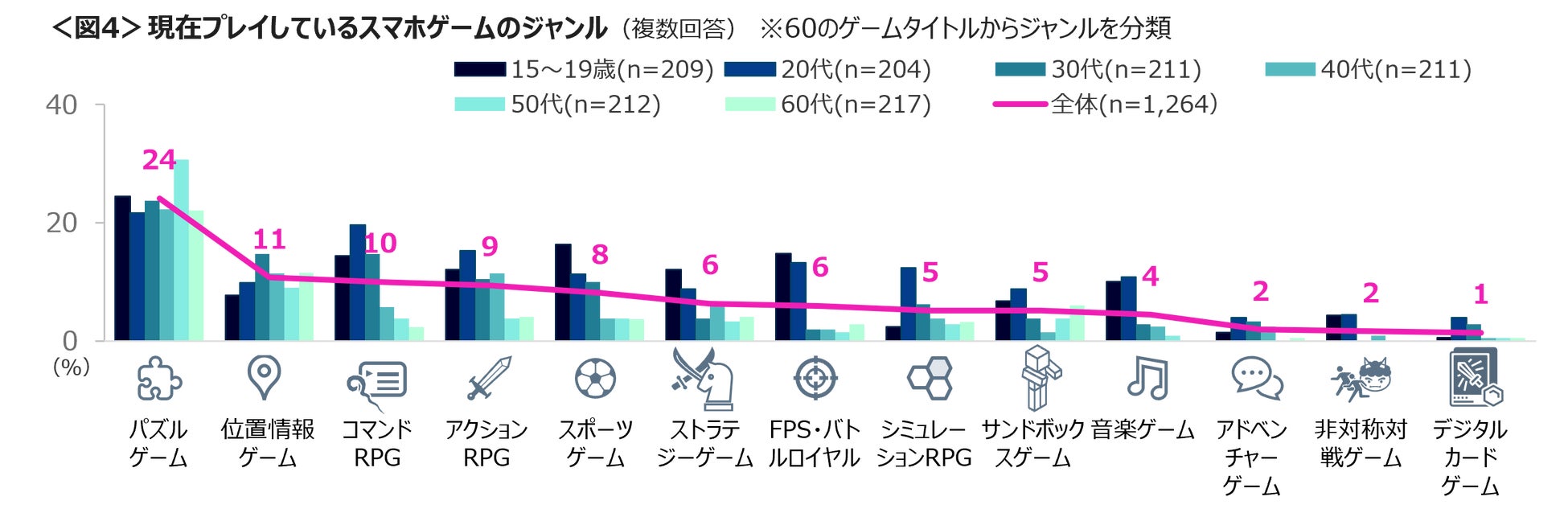 ゲームタイトルからプレイしているジャンルを確認した結果、「パズルゲーム(LINE:ディズニーツムツムなど)」24%、「位置情報ゲーム(Pokémon GOなど)」11%、「コマンドRPG(Fate/Grand Orderなど)」10%、「アクションRPG(モンスターストライクなど)」9%、「スポーツゲーム(プロ野球スピリッツAなど)」8%がTOP5。50代は、「パズルゲーム」のプレイ率が31%と高い。<図4>