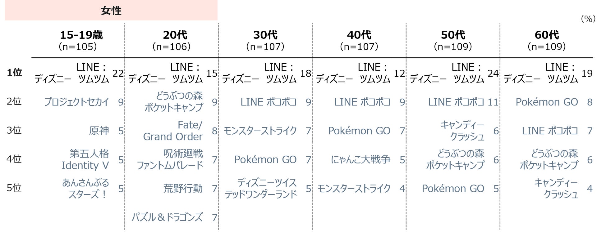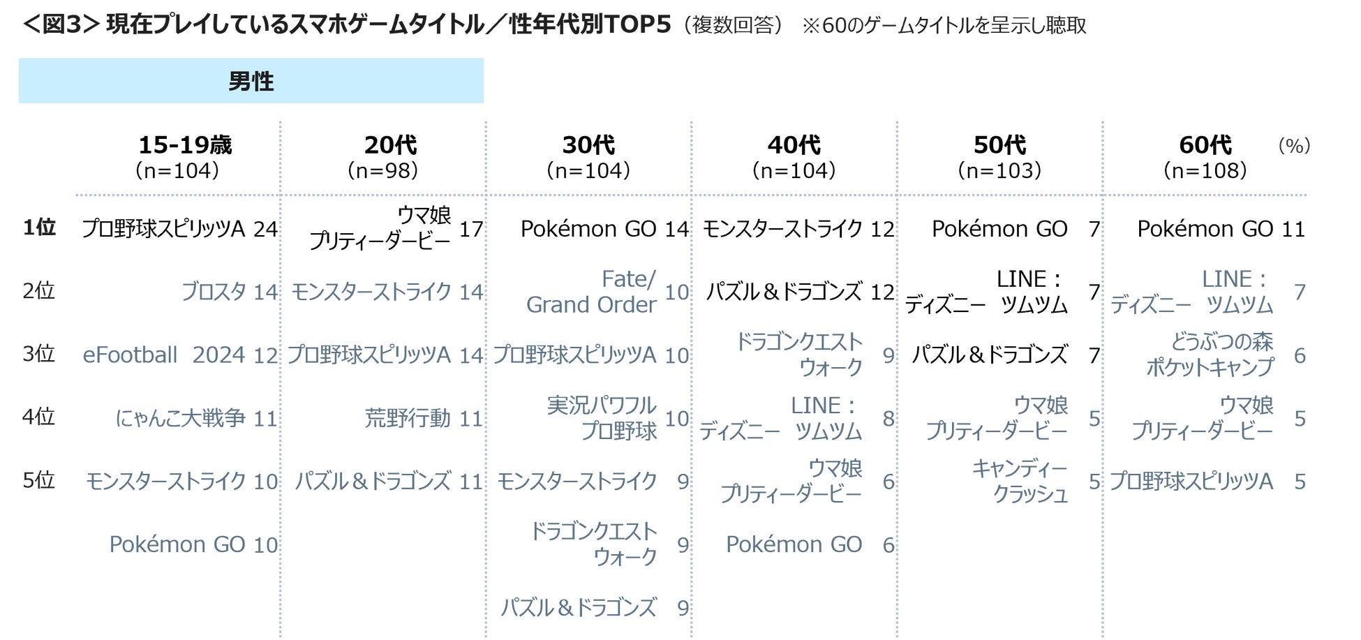 現在プレイしているゲームタイトルを聴取した結果、男性の15~19歳は「プロ野球スピリッツA」、男性20代「ウマ娘プリティーダービー」、男性30代と60代は「Pokémon GO」、男性40代は「モンスターストライク」がTOPにあがる。男性50代は「Pokémon GO」「LINE:ディズニーツムツム」「パズル&ドラゴンズ」が並んだ。女性は、全世代において「LINE:ディズニーツムツム」がTOPであった。<図3>