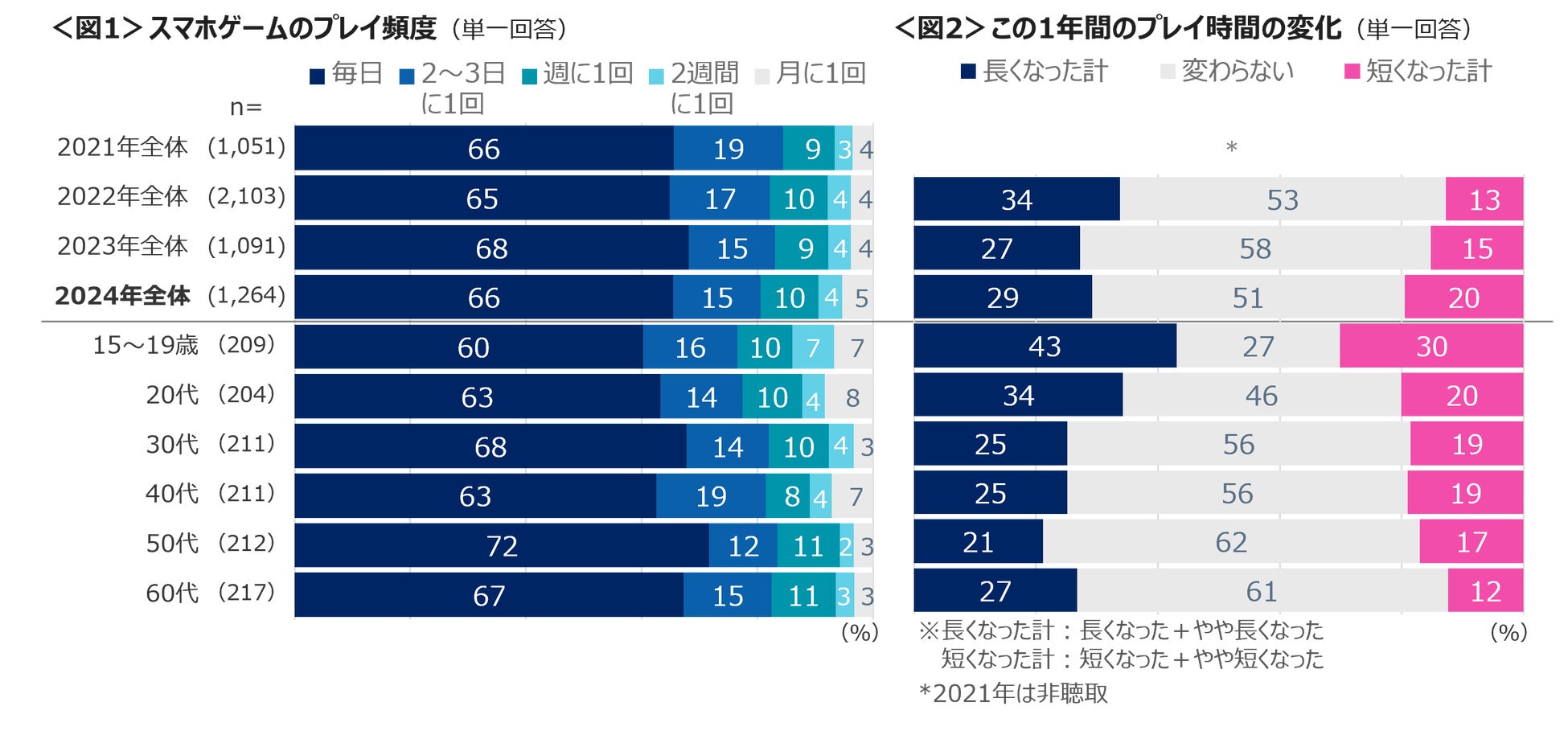 株式会社クロス・マーケティング(本社:東京都新宿区、代表取締役社長:五十嵐 幹)は、2024年7月、スマホゲームを月1回以上プレイしている全国15~69歳の男女1,264名を対象に「ゲームに関する調査(2024年)スマホゲーム編」を行いました。今回は、プレイ頻度、プレイ時間の変化、ゲームタイトル、ゲームジャンル、直近1か月間のゲーム関連費の支出内容に注目し分析をしました。