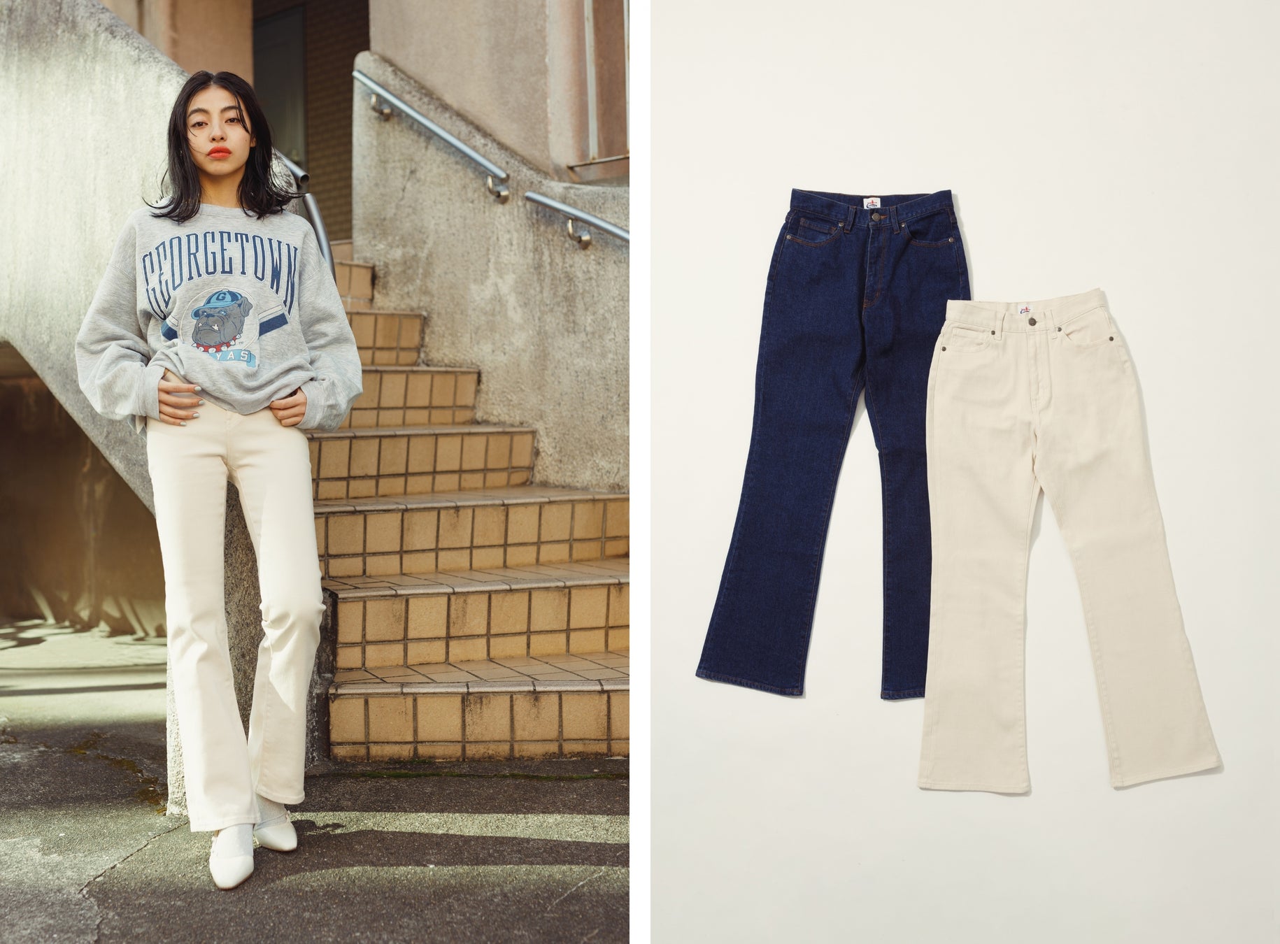高い位置のウエストマークでタイトフィットに設計し、膝下から適度なフレアシルエットで、タイトフィットでも動き易く、女性らしいメリハリのあるラインと、履き心地を両立させたジーンズです。